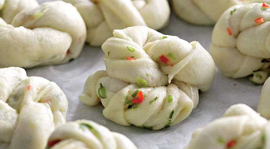 - Разогреваем или включаем пароварку и раскладываем на решетке булочки, оставив между ними по паре сантиметров. В процессе варки булочки увеличатся и могут слипнуться, если положить их слишком близко. В Таиланде каждую булочку еще кладут на отдельный кусочек пекарской бумаги.