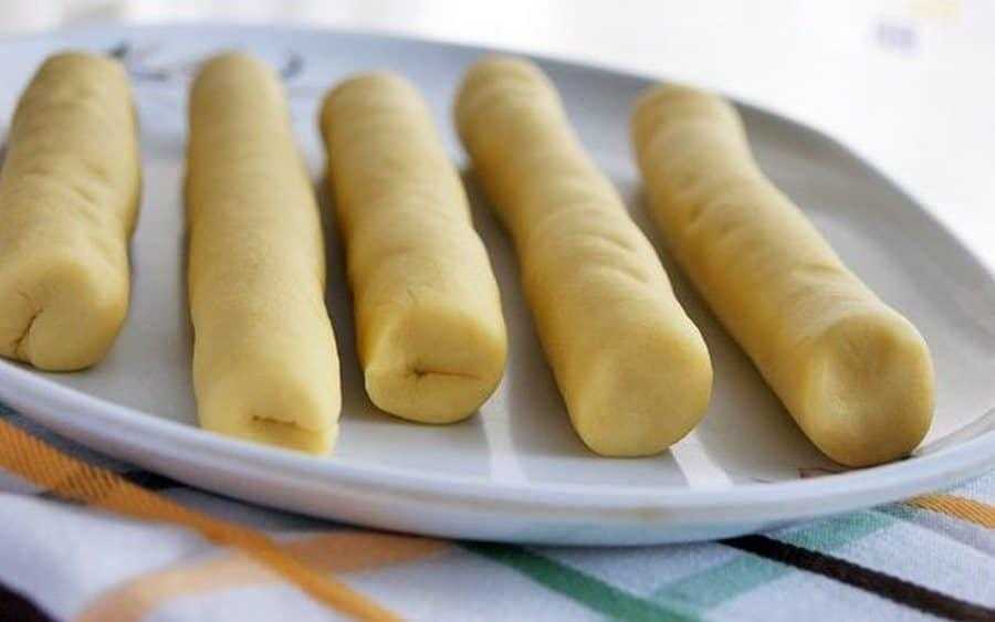 Тесто раскатываем в такие колбаски, затем нарезаем их на куски. Оставляем их на 7 минут отлежаться