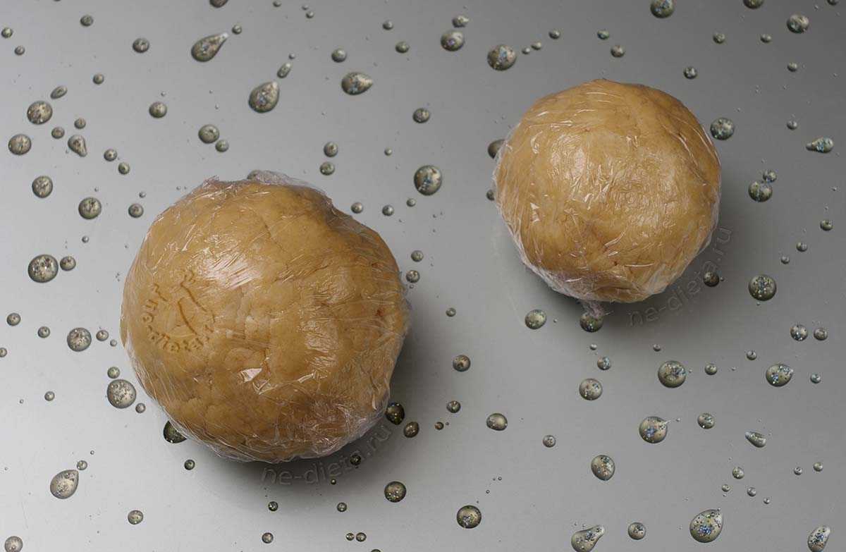 - Тесто разделите на две неравные части, оберните их в пищевую пленку и поместите в холодильник на полчаса.