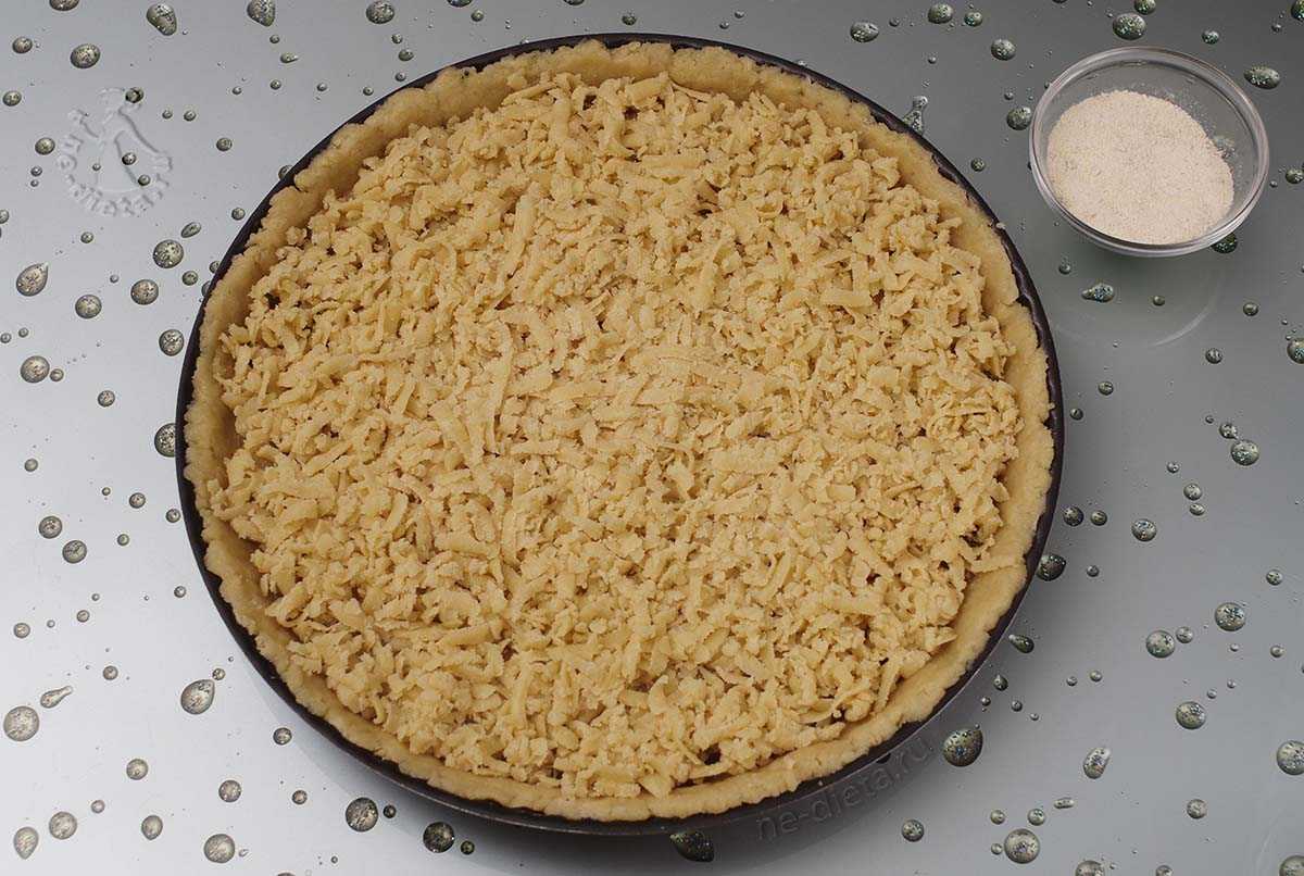 Поверхность пирога присыпаем тестом (которое находилось в морозилке все это время). Натираем этот кусочек теста на терке и размещаем по поверхности пирога. У меня начинка не полностью покрыта тестом, но если вы хотите плотное покрытие, можете оставить побольше теста для охлаждения.