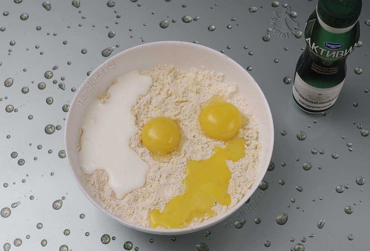 4. Недолго вымешивать тесто руками, пока все ингредиенты не начнут собираться в комок. Если тесто вдруг получится суховатым и будет сильно крошиться, то в него следует добавить еще 1 – 2 ст. л. йогурта.