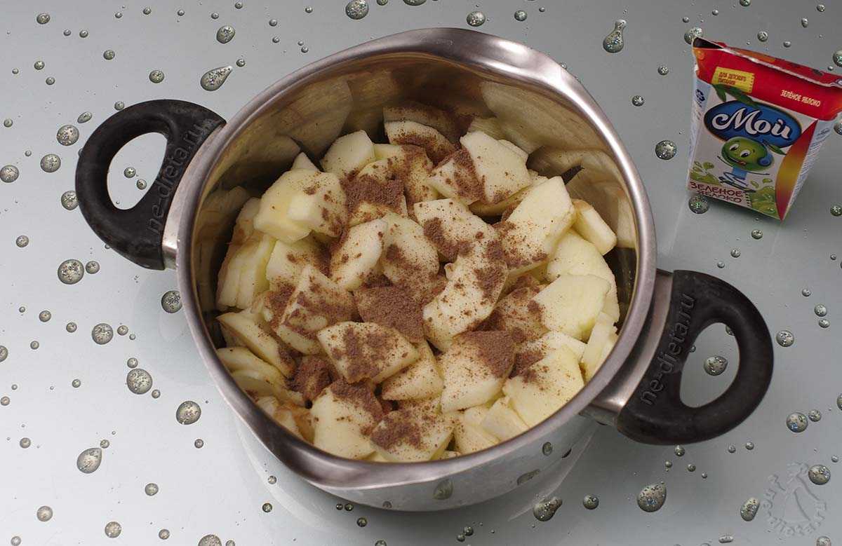 6. Яблоки сложить в кастрюлю, посыпать специями, залить яблочным соком и поставить на небольшой огонь. Если нет под рукой яблочного сока, можно заменить его обычной водой.