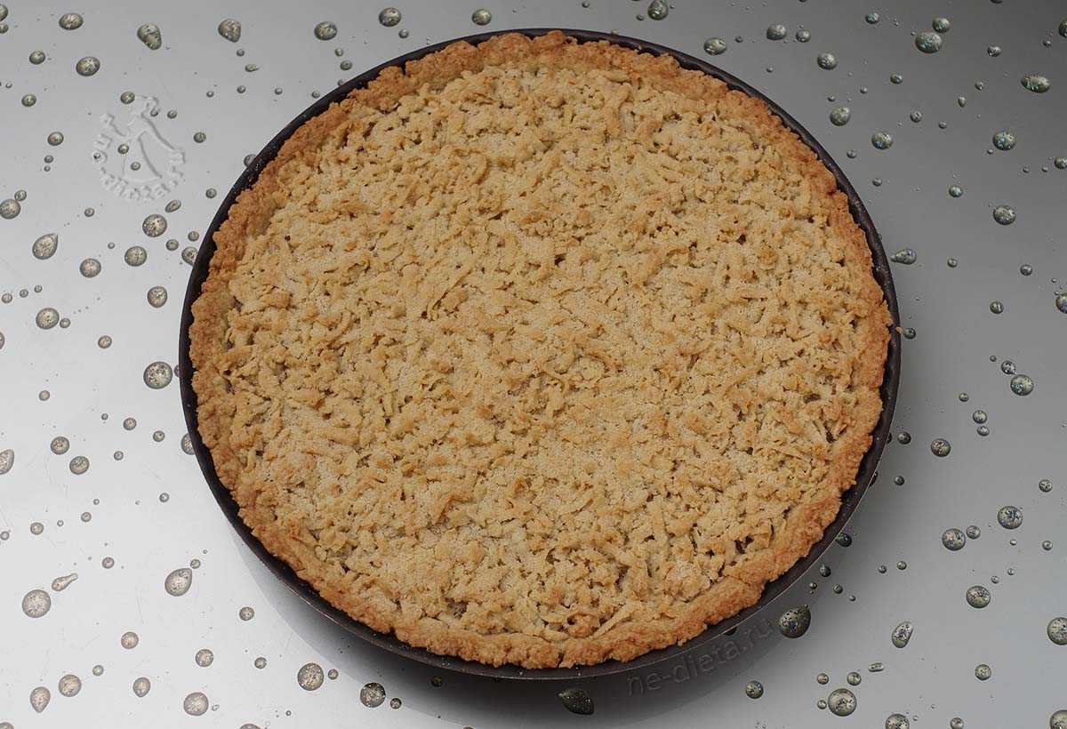 Оставшуюся часть теста измельчите в крошку и украсьте ей поверхность пирога.
