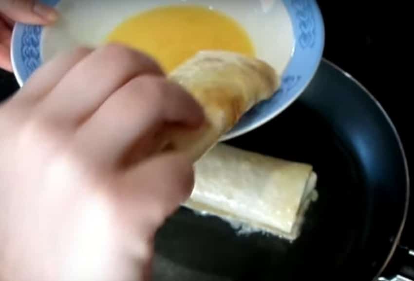 5. Обмакните творожный рулет в яйце и выложите его на сковороду. Обжарьте закуску с обеих сторон до золотистого цвета.