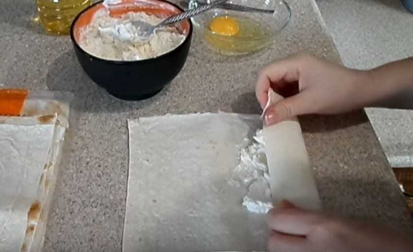 1. Тонкий лаваш нарезается квадратами небольшого размера. 2. В угол квадрата укладывается начинка до середины. 3. Другая половина укладывается наверх и получается треугольник. 4. Чтобы края скрепились, до складывания смажьте их сырым яйцом или водой и прижмите. 5. Сформированные уголки обжариваются с двух сторон на сковороде с небольшим количеством масла. 6. На стол подаются в горячем виде с различными соусами.