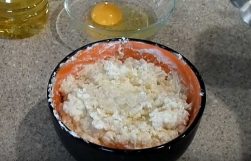 - Творог размять вилкой, можно чуть-чуть в блендере.