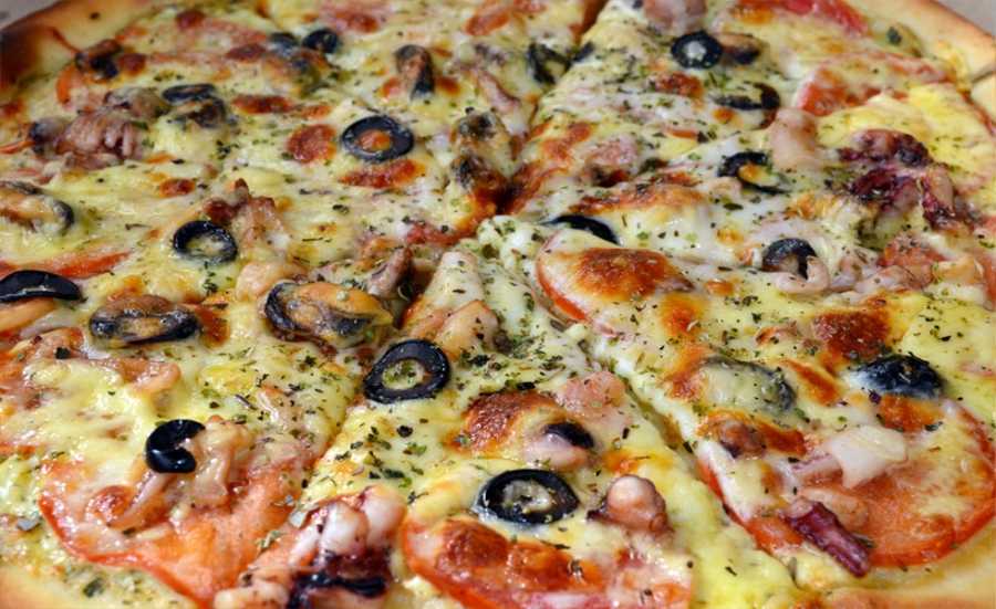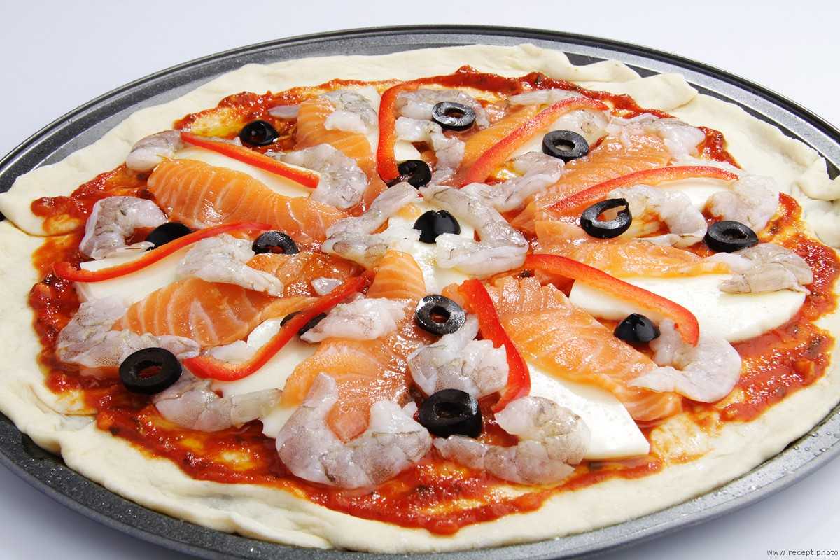 - Изюминкой всех начинок станет пицца из даров моря. Можно использовать креветки, кальмары, тунца из консервной банки или купить морской коктейль. Оттенить необычайный вкус морепродуктов смогут нарезанные колечками маслины.