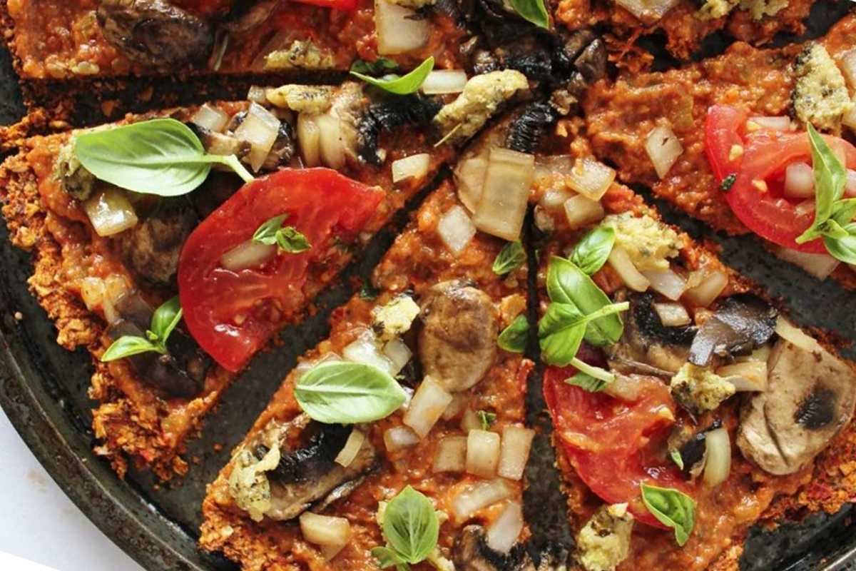 Перед запеканием пиццы предварительно нужно запечь овощи — это поможет избавиться от лишней влаги, которая в противном случае впитается в тесто при выпечке. Не бойтесь раскатывать тесто как можно тоньше: так пицца получается более хрустящей. Тесто можно использовать покупное, а можно сделать его по одному из рецептов, которые есть в этой подборке.