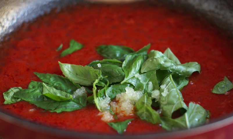 5. Очищенный томат пробить блендером в пюре. На сковороде прогреть 2 ложки масла, добавить томат, чеснок и 1 веточку базилика. Потушить смесь 5 минут. По вкусу заправить солью и сахаром. С помощью второго отрегулировать кислоту соуса.
