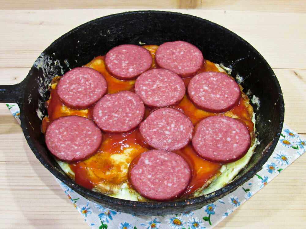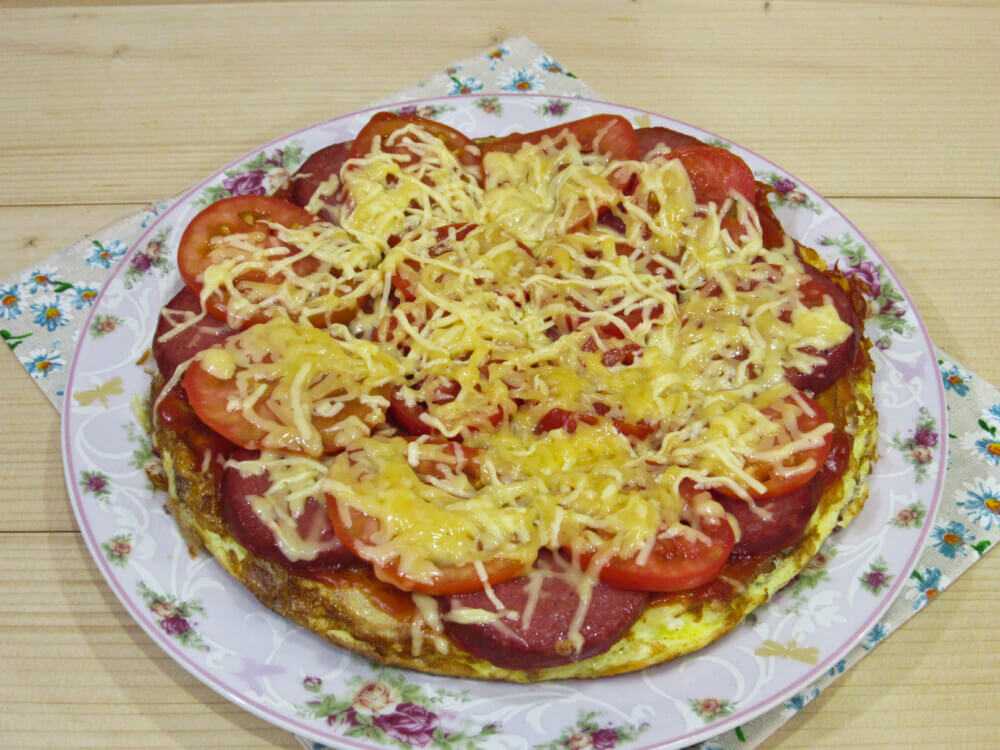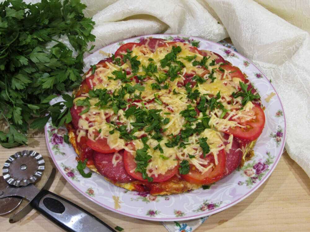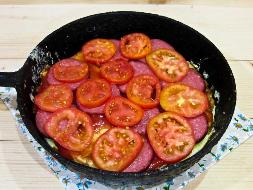 Если нет возможности воспользоваться духовкой, можно приготовить пиццу с колбасой, сыром и помидорами на сковороде.