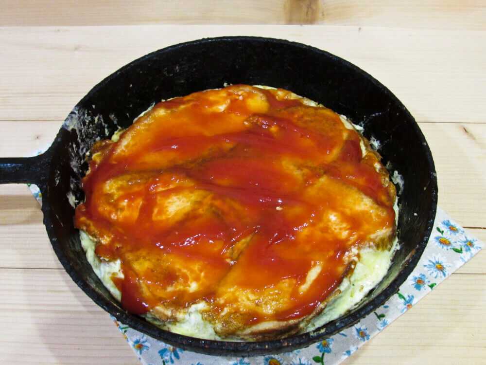Всю поверхность я смазываю кетчупом. У меня домашний. Можно взять магазинный. Острый или не острый, это на ваш выбор и вкус. Если не желаете класть кетчуп, этот шаг можно опустить.