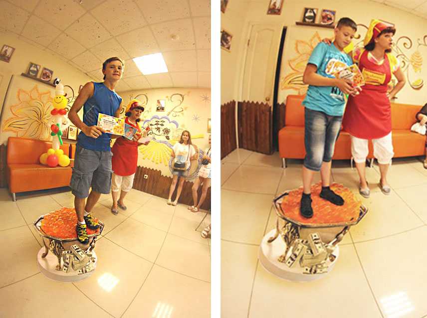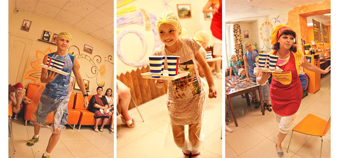 Задача: Донести подносы до финальной черты (в нашем случае до дивана, где в это время сидели родители). Улыбнуться, слегка поклониться и пойти обратно.