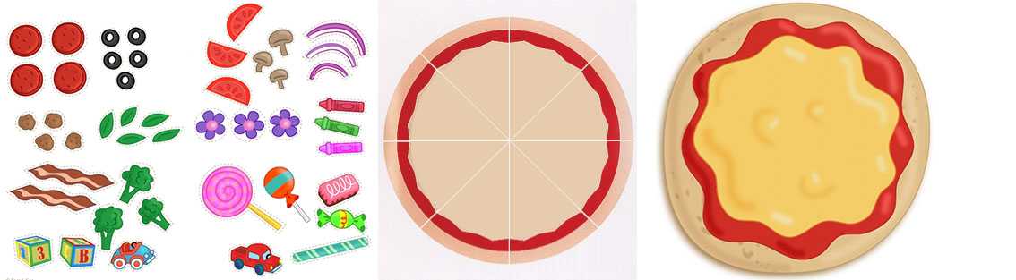 Для этой игры хорошо бы иметь пиццу на липучках. У нас таких 2. Если у вас нет, о можно нарисовать пиццу и ингредиенты и приклеивать с помощью клеевого карандаша.