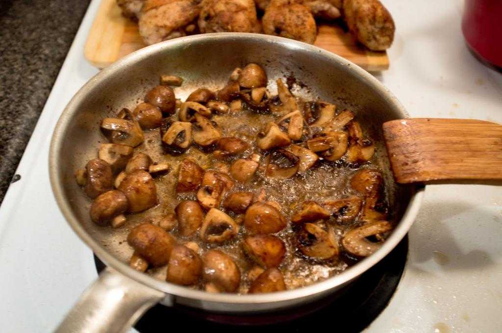 - Обжарьте грибы на сливочном масле с измельченным чесноком. Смешайте с картошкой, посолите и добавьте перец.