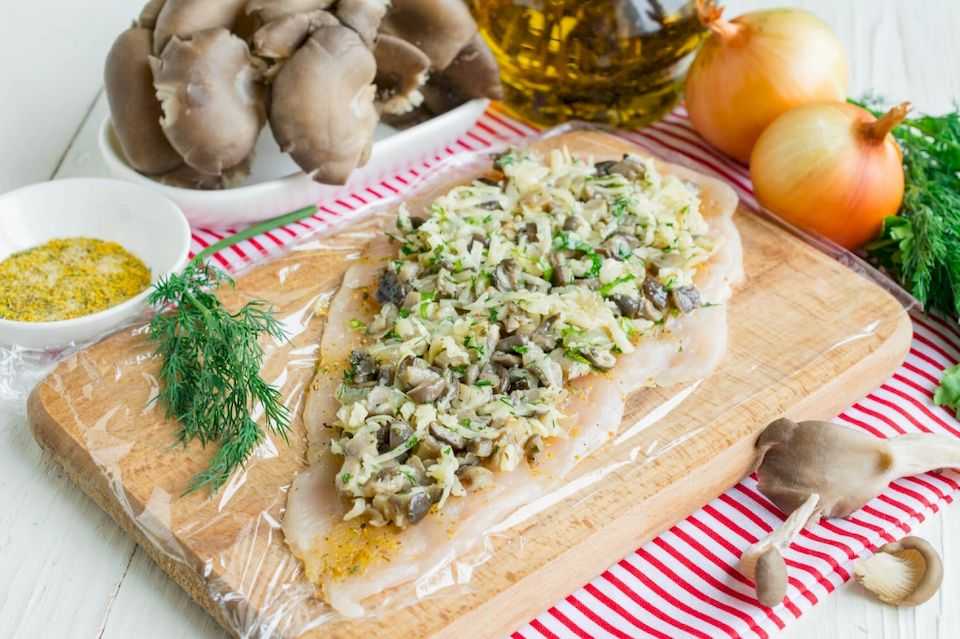 7. Распределить грибную начинку с твердым сыром на курином филе, оставив один край свободным.