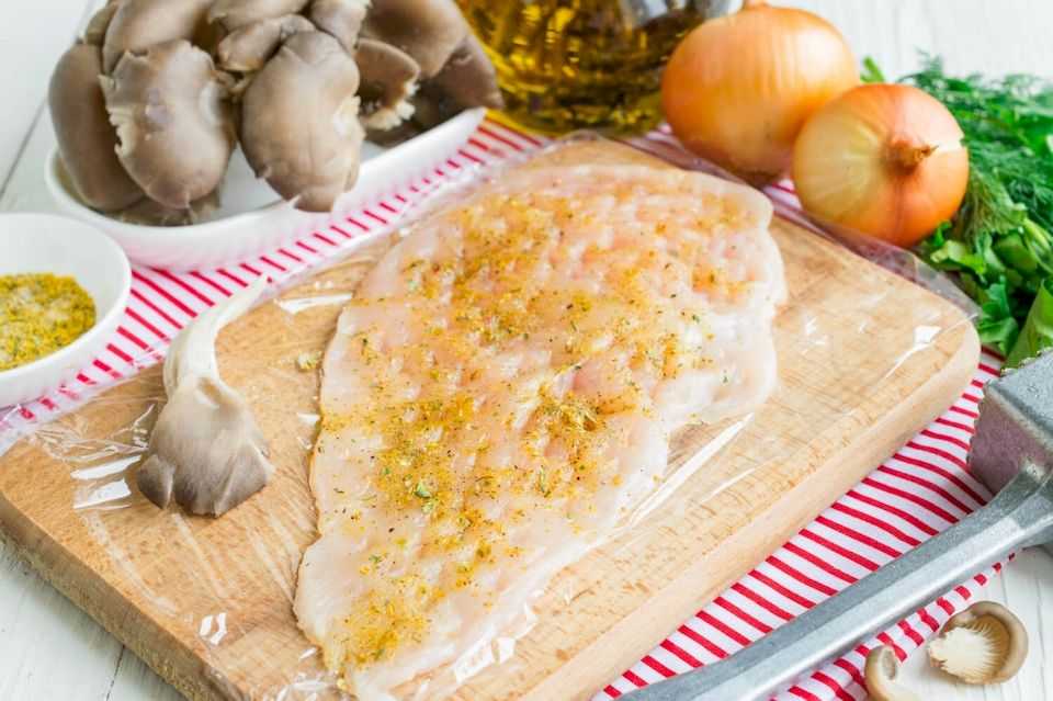 6. Посолить, приправить специями и отбить мясорубкой каждый кусок куриного филе.