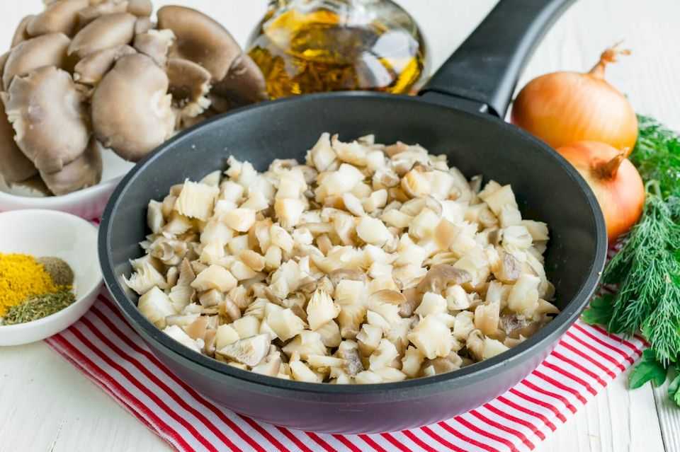 2. Вешенки вымыть и срезать толстую основу. Грибы нарезать кубиками среднего размера. Когда лук поджарится и станет мягким, добавьте к нему нарезанные вешенки. Медленно помешивая, обжарить грибы с луком до полного испарения жидкости со сковороды.