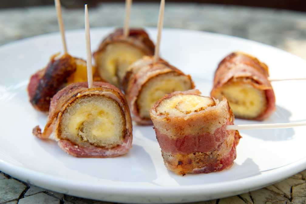 Из бекона можно приготовить очень вкусные рулетики с самыми разными начинками. Такие рулеты можно жарить на сковородке, но особенно вкусными они получаются запеченными в духовке. В качестве основы для начинки подойдут грибы, курятина, говядина, индейка, любой мясной фарш. Можно также задействовать сыр, помидоры, лук, любые ваши любимые специи.