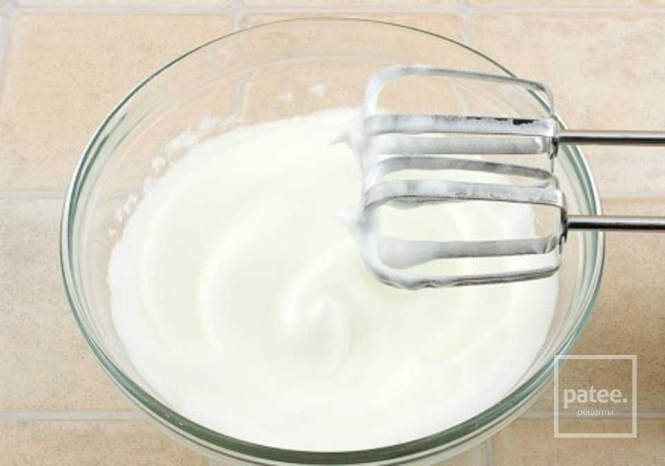 - В отдельной емкости взбей белки с щепоткой соли и лимонным соком в стойкую пену.