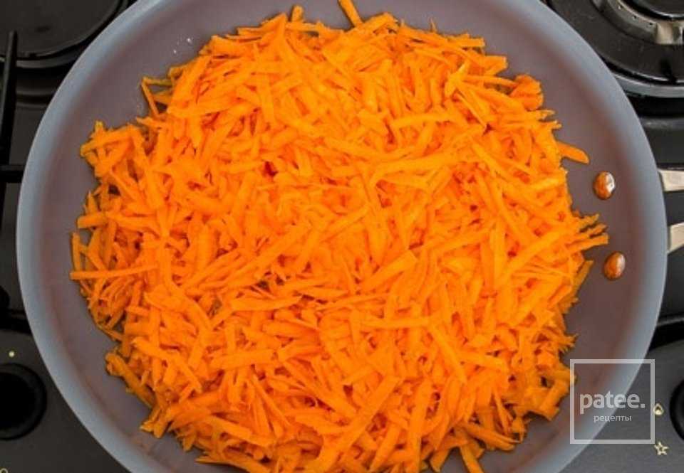 - Очисти морковь и натри на крупной терке. Обжарь до размягчения в сковороде под крышкой на сливочном масле около 5 минут.