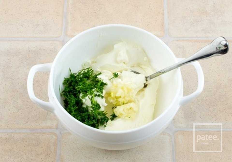 Для начинки положить все компоненты в емкость (сливочный сыр должен быть комнатной температуры). Мне одного небольшого зубчика чеснока более чем достаточно, но ориентируйтесь исключительно на свой вкус. Укропа нужно совсем немного, обязательно оборвите его от веточек и порежьте как можно мельче