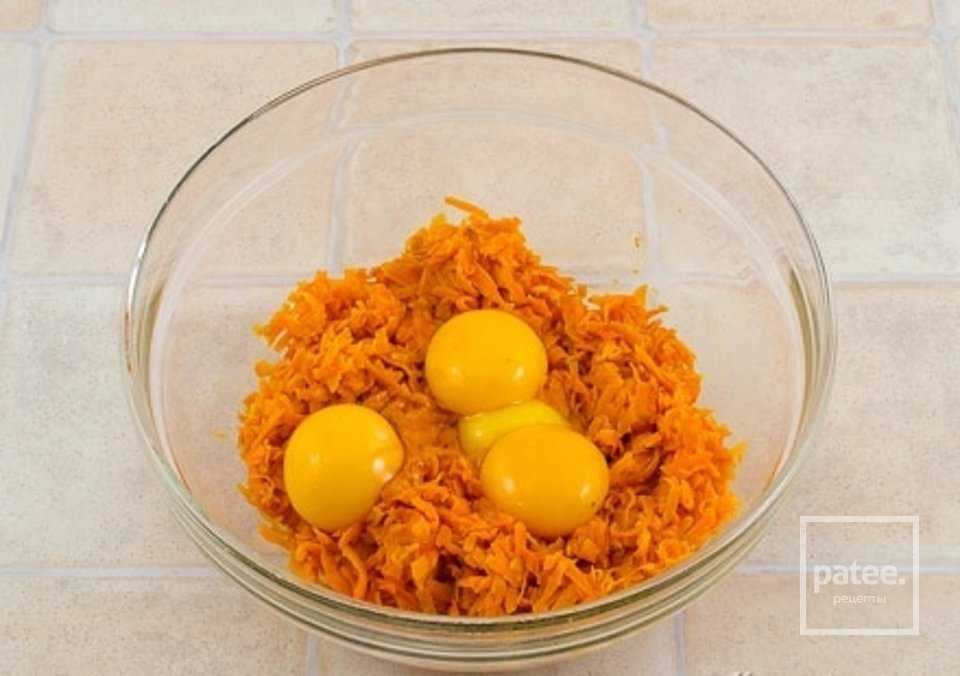 Морковь пассеруем на растительном масле под крышкой до мягкости. Морковь остудить. Яйца разделить на белки и желтки. Желтки перемешать с морковью.