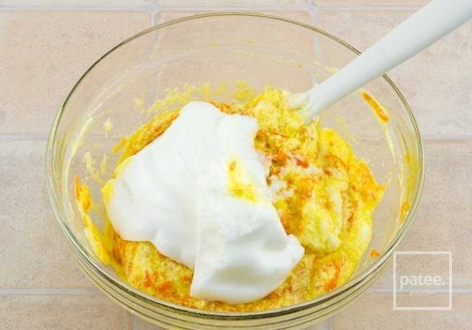 Частями добавить взбитые белки к моркови, аккуратно вмешивая их после каждой порции.