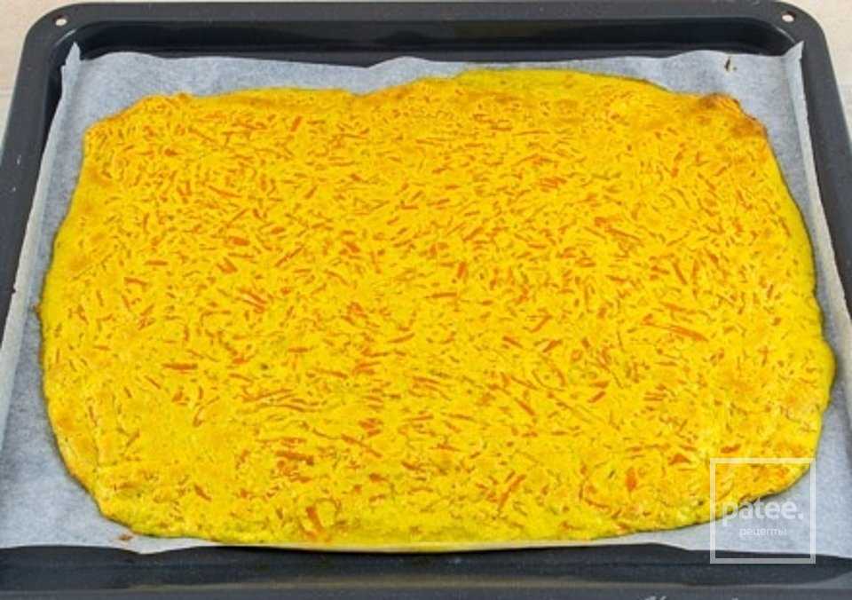 Противень застелить листом пекарской бумаги, выложить морковную массу в прямоугольник примерно 30х35 см. Из массы может выделяться немного жидкости по краям, это нормально, масса сама по себе не однородная.