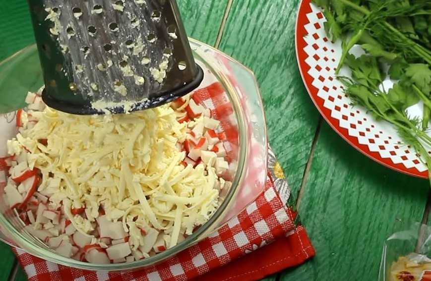 1. Крабовые палочки нарезаем мелким кубиком. Складываем в миску, в которую будем добавлять остальные ингредиенты начинки. Плавленый сырок натираем на крупной терке. Если Вы не сторонник такого продукта, можно использовать любой сыр. Подойдет твердый или полутвердый. Правил здесь никаких особых нет. Главное понять принцип и тогда это блюдо будет частенько красоваться на Вашем столе.