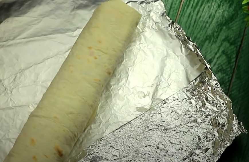 Скручиваем лаваш в тугой рулет. Делаем это не спеша, чтобы тонкий лаваш не порвался. Упаковываем рулет в пищевую пленку, фольгу или простой полиэтиленовый пакет и отправляем в холодильник на 1-2 часа – пропитаться.