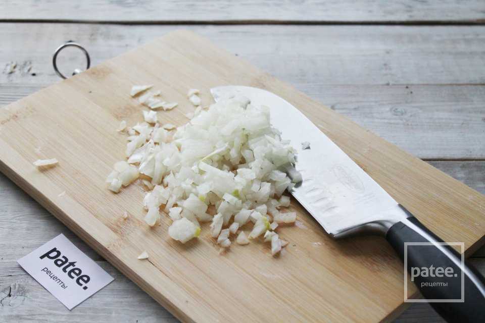 Сельдь тщательно разделайте, полностью удаляя хребет и все мелкие кости. Полученное филе нарежьте произвольными кусочками, киньте на последний лист лаваша. Головку лука отшелушите от пленки, некрупно нашинкуйте, добавьте к селедке.
