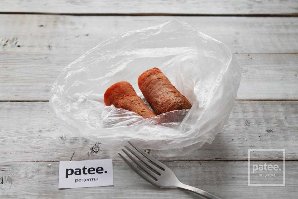 Оборачиваем пищевой плёнкой лаваш с овощами и завязываем узелки по краям. Чтобы рулет пропитался, достаточно будет убрать его на несколько часов в холодильник.