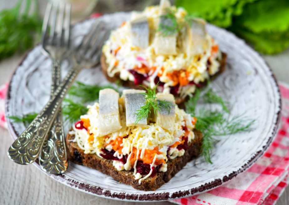 Сельдь под шубой на черном бородинском хлебе будет вкусной закуской на фуршет или обед.
