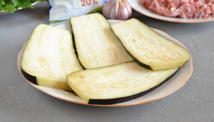 - Помоем баклажан и удалим плодоножку. Разрежем его на продольные пластинки толщиной 5 мм. Поместим баклажаны в миску, посыплем солью и оставим на 10–15 минут для удаления горечи. Затем удалим бумажной салфеткой лишнюю жидкость.