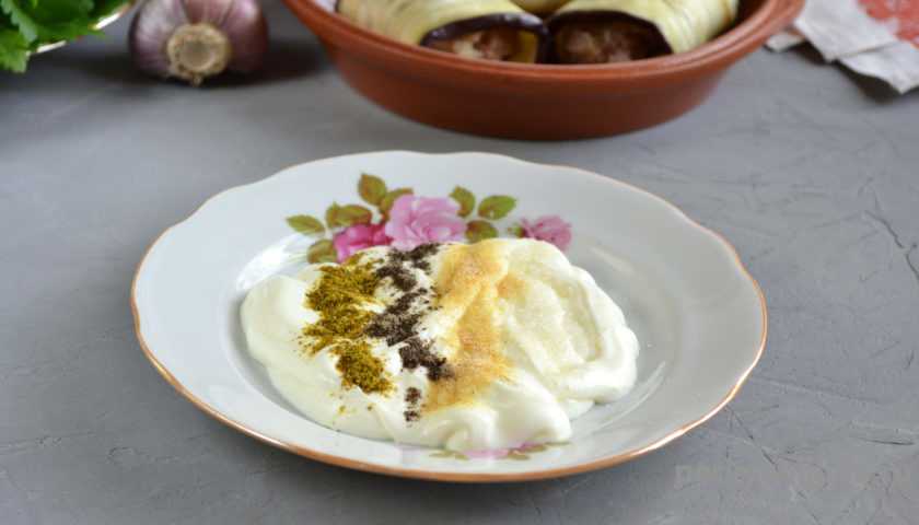 11. Сметану дополняем солью, чесночным порошком, остатками хмели-сунели и молотым перцем. Перемешиваем. Можно добавить в сметану измельченный свежий чеснок, но при запекании он будет подгорать.