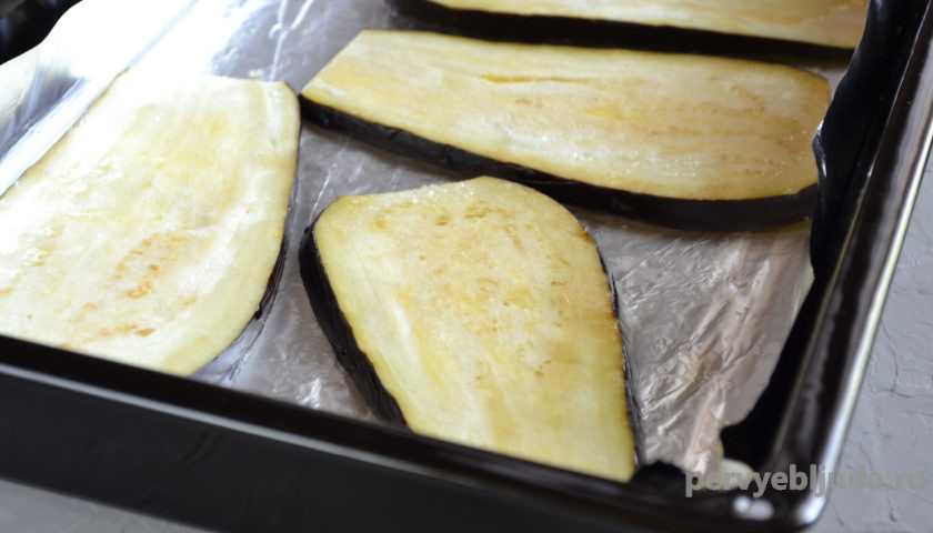 3. Через 10 минут перекладываем ломтики баклажана на противень (можно застелить фольгой или бумагой для выпечки), сбрызгиваем маслом и отправляем в духовку, разогретую до 220 градусов, на 8-12 минут. Ломтики не должны стать слишком мягкими, иначе они не сохранят целостность.