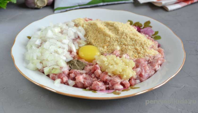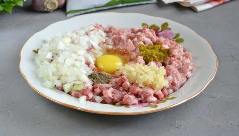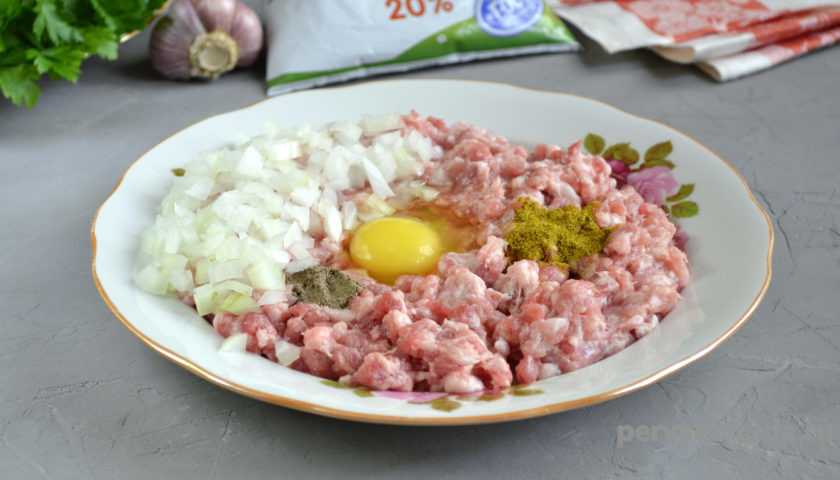 4. Если готовим блюдо из домашнего фарша, то лук с чесноком измельчаем вместе с мясом. В фарш, приобретенный в магазине, добавляем мелко нарезанный лук, яйцо, соль, хмели-сунели (немного оставляем для сметаны) и черный перец.