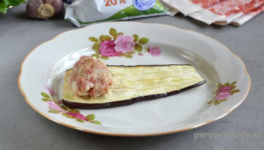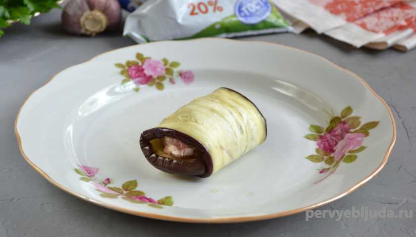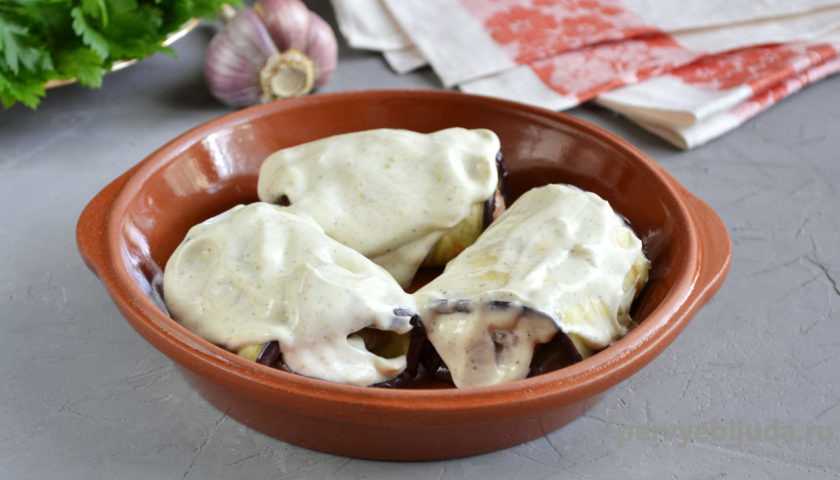 12. Смазываем подготовленные рулетики из баклажана ароматной сметаной и отправляем в духовку (она уже включена на 220 градусов) на 35-40 минут. Рулетики должны покрыться румяной корочкой.