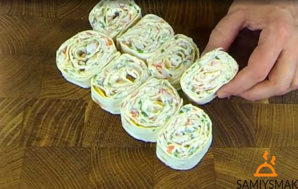 - Размажьте начинку по всей поверхности лаваша. Заверните рулетом. Отправьте в пакете или пищевой пленке в холодильник на 2 часа.
