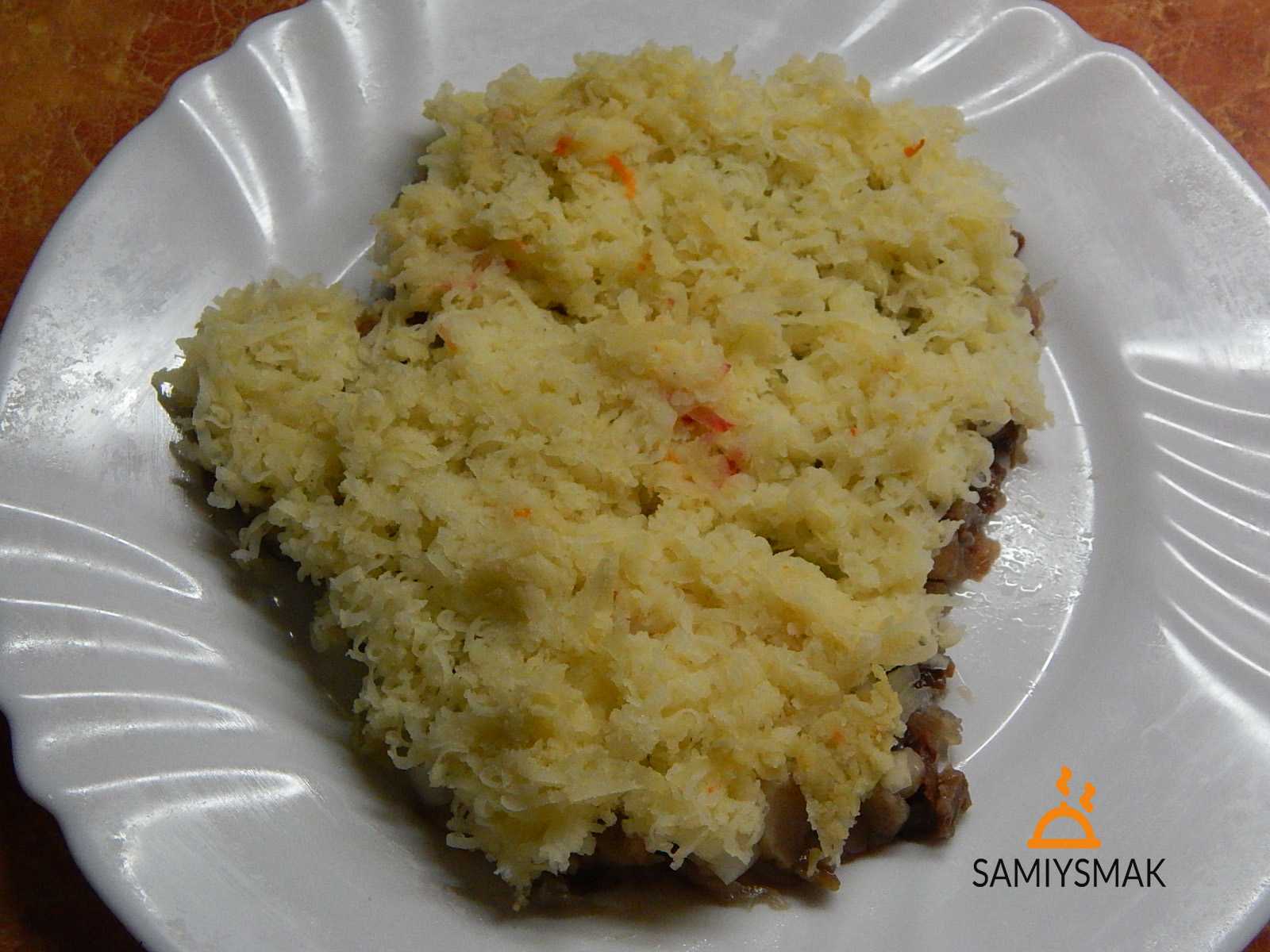 - 1-й слой – картофель, сверху сельдь и лук
