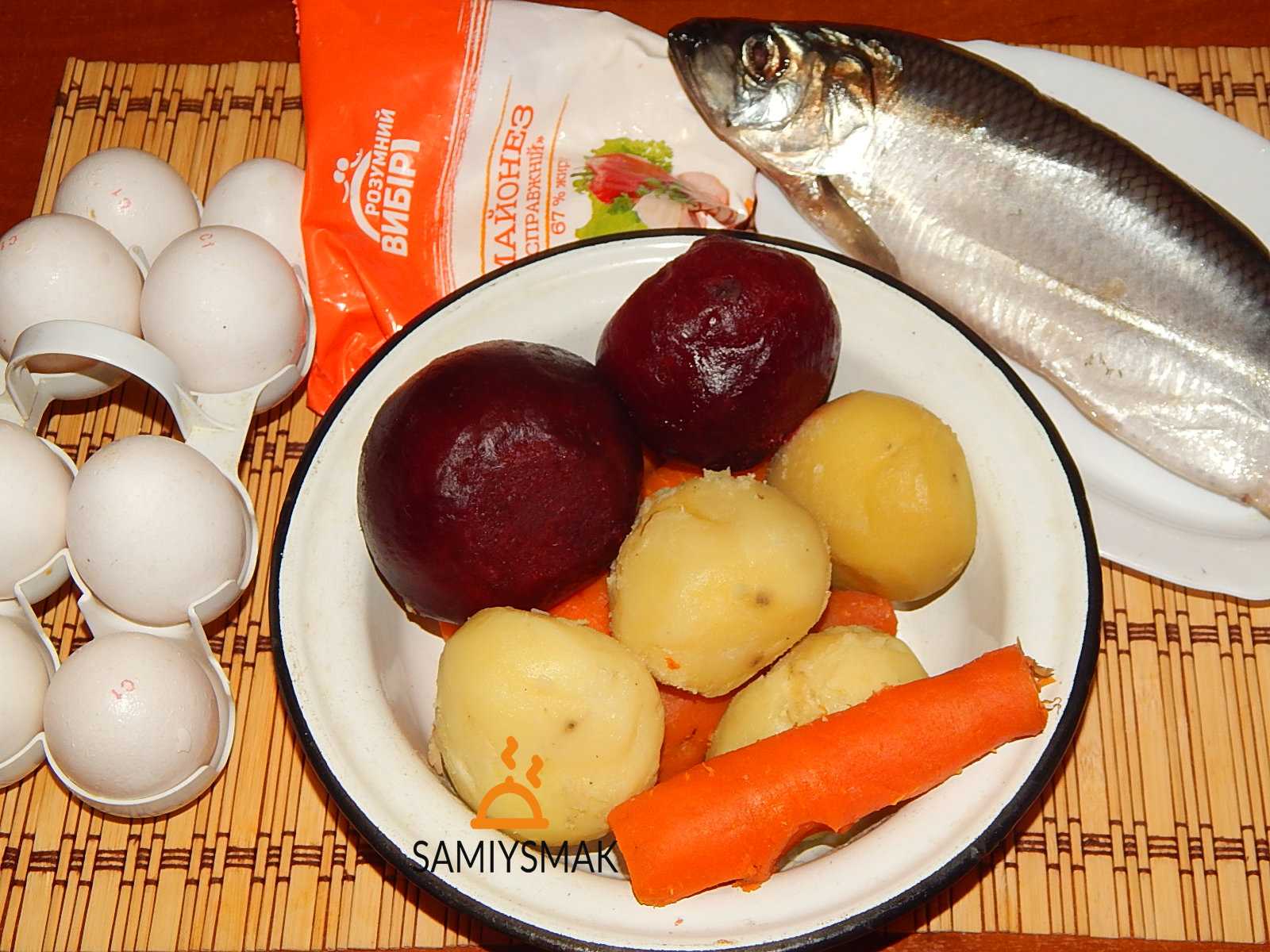 - Картофель, свекла и морковь отвариваются, остужаются, очищаются и натираются.