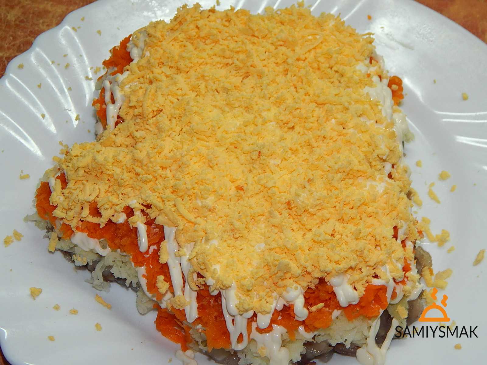 Далее поочередно выкладывайте морковный и яичный слой, также поливая каждый майонезом.