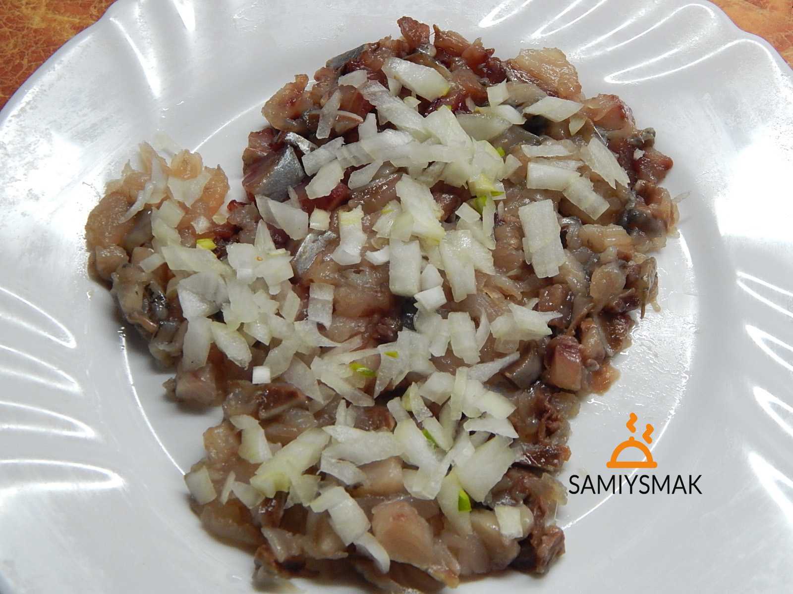 - Филе соленой сельди нарежьте мелкими кубиками. Смешайте с нарезкой зеленого лука. Добавьте ложку оливкового масла.
