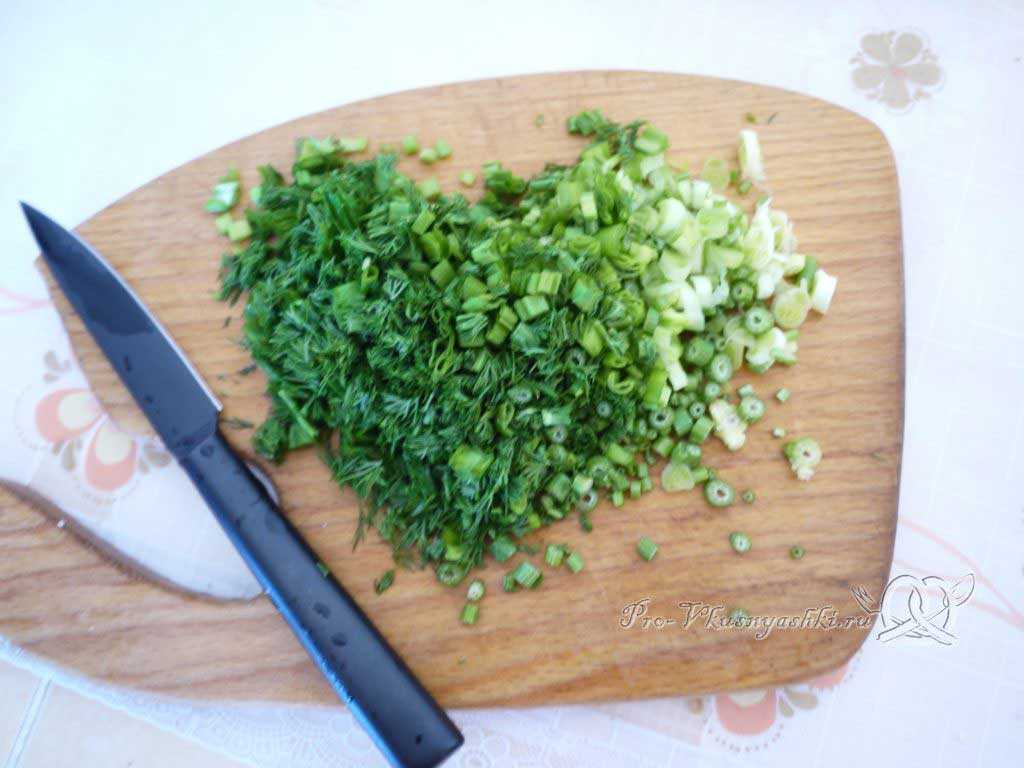 Зелень мелко рубим.