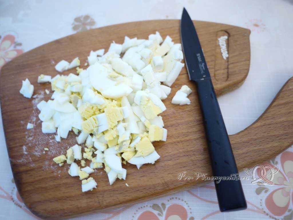 Яйца сварились. Чистим их и нарезаем мелким кубиком.