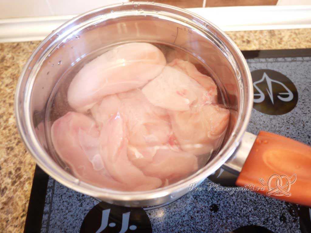 На плиту ставим сотейник с водой, кладем туда куриное филе и варим 25-30 мин до готовности (мясо легко протыкается вилкой, выделяя прозрачный сок).