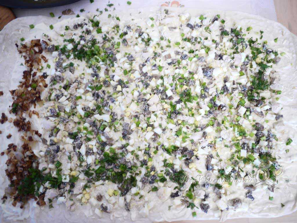Затем отступив от края 1-2 см, выкладываем полоску жаренного лука. На оставшуюся часть кладем начинку из миски, распределяем по всей поверхности ровным слоем. Посыпаем лаваш с начинкой зеленью.