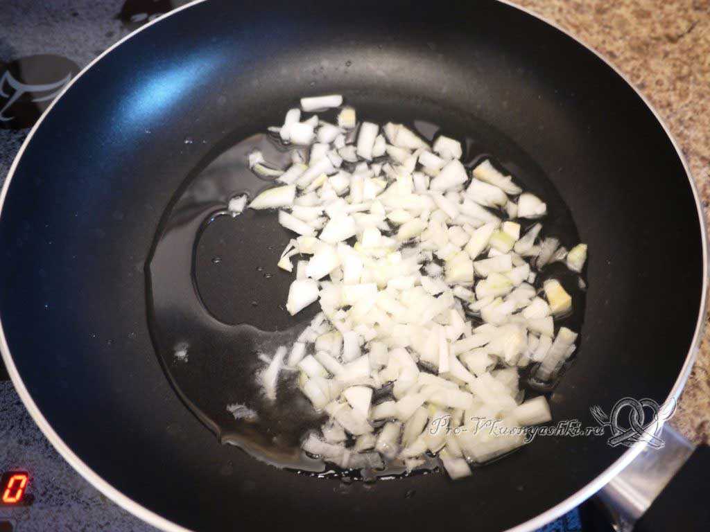 Лук нарезать как можно мельче и отправить обжариваться на растительном масле.
