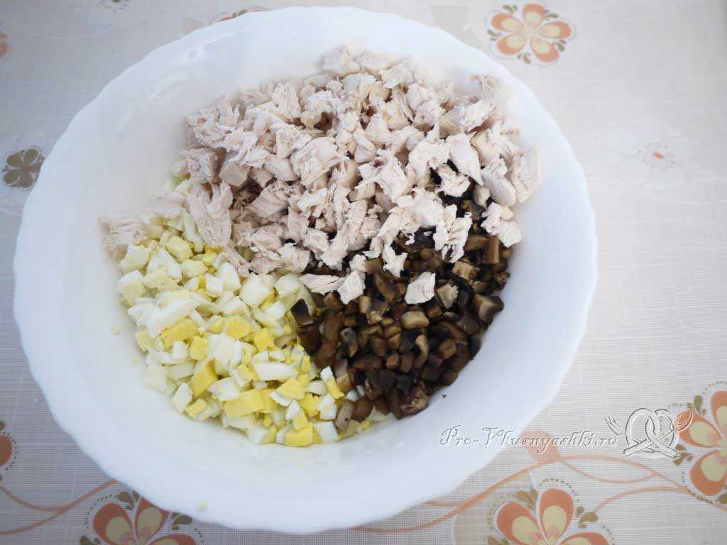 Помещаем жаренные грибы, вареные и нарезанные яйца и куриное филе в глубокую миску. Перемешиваем и солим по вкусу.