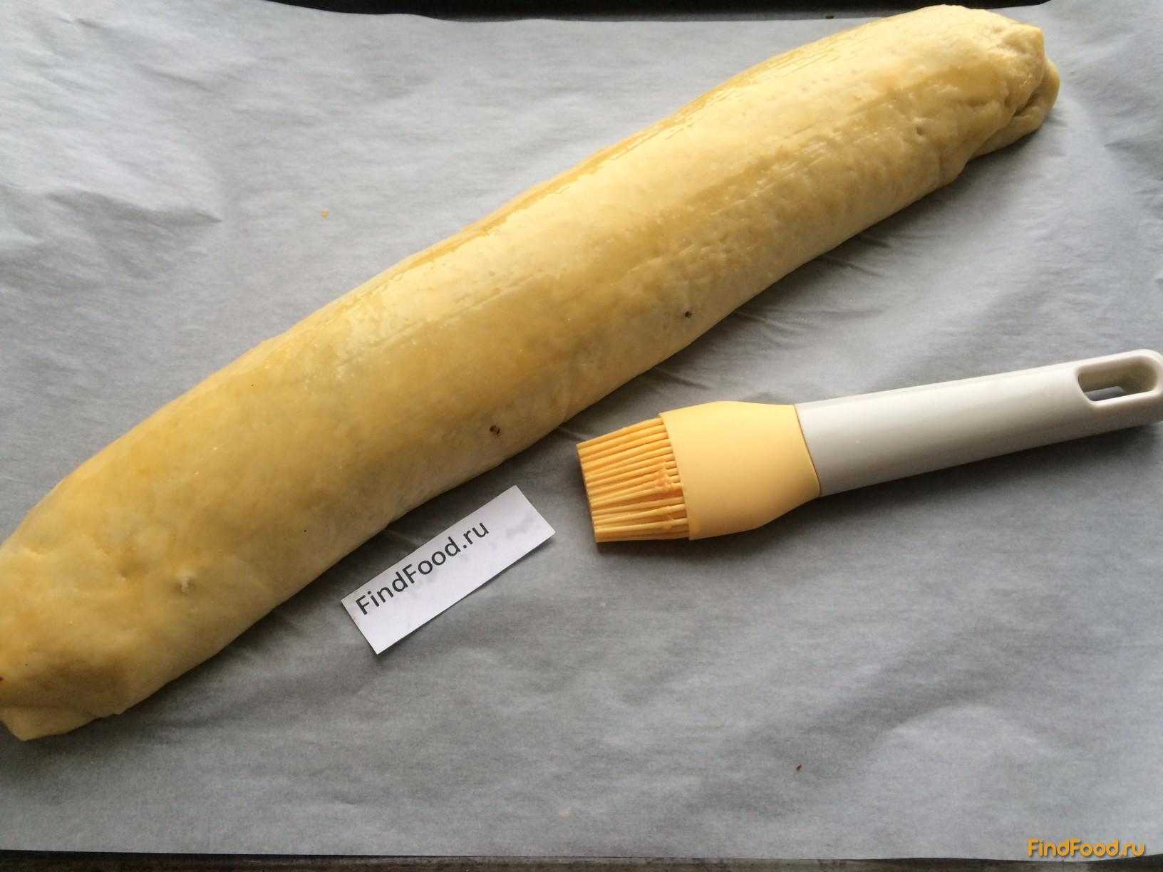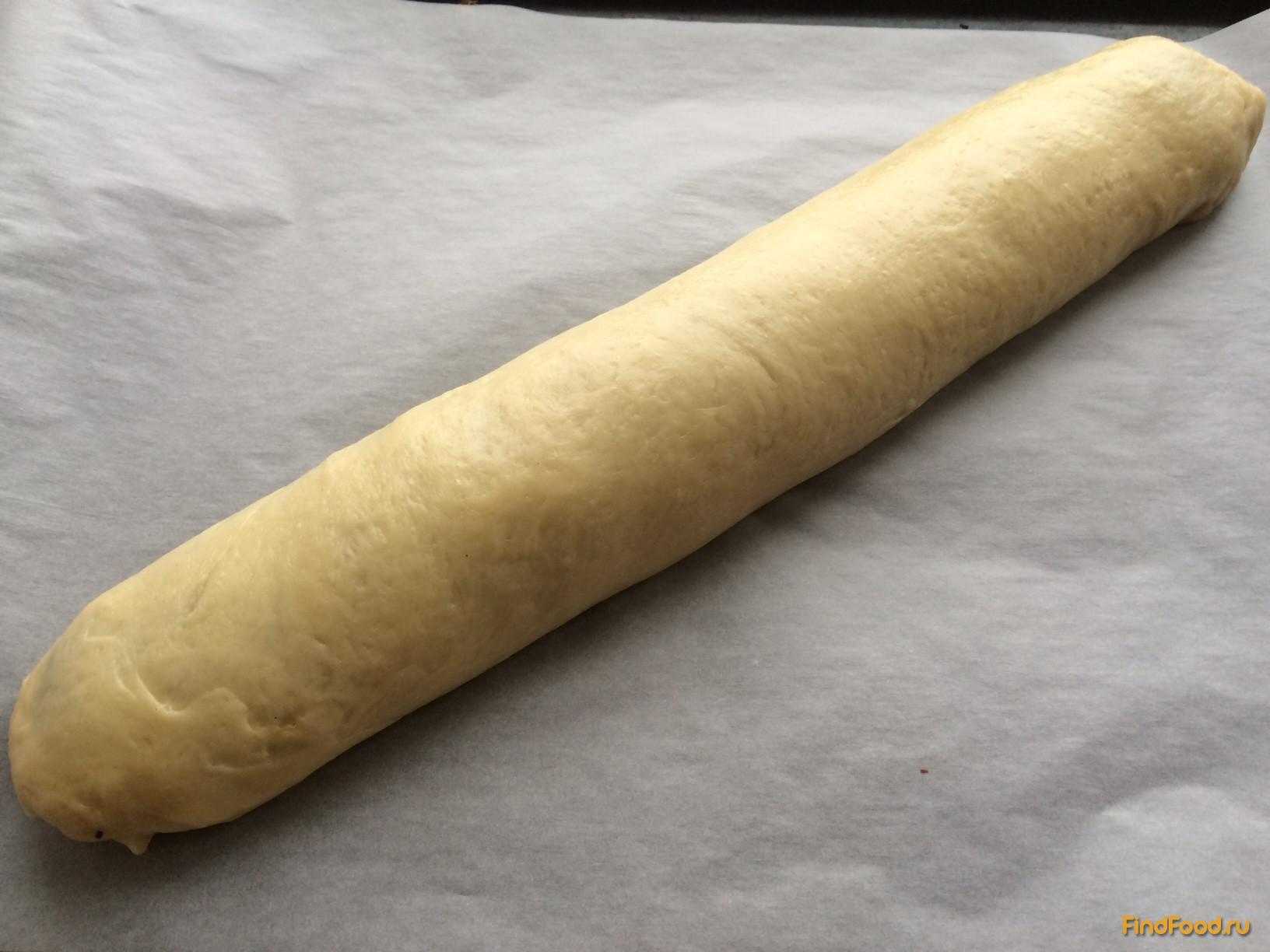 Свернуть тесто в рулет и аккуратно переложить его на лист для запекания. Чтобы рулет не прилип, застелите лист пергаментом. Рулет перед выпечкой должен постоять еще минут тридцать. Он заметно увеличится в объеме.